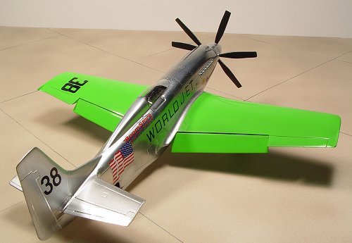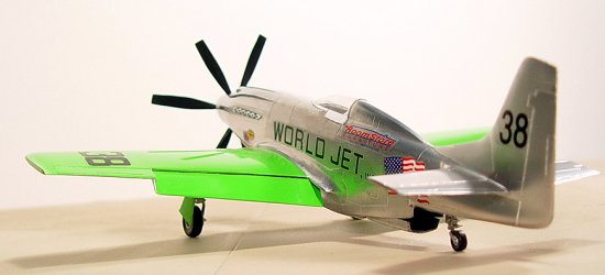 Next thing on the list is the decals. I found the decals to be very delicate. I recommend a coat of decal film to help strengthen them up a bit. You really need a picture in front of you as to which “World Jet. Inc” you want to do. Place the decals very carefully. You will see a dull film where the carrier film is. You can make some of this go away with a coat of clear. But the clear coat will dull the silver just a bit. That is the trade-off. The number 38 goes on the top of the left wing and bottom of the right wing but they are oriented so that the Reno crowd can read the number when the plane makes its knife edge passes around the pylons. I broke off the pitot tube and lost it. One day I will get back to putting another one on. It looks like any stock P-51 pitot tube in the same place on the right wing.