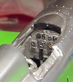 The instrument panel out of the Revell kit is terrible for a WWII era P-51D but matched perfectly for the highly modified World Jet Racer. A few extra knobs and some modern radio panels were added per the picture of the cockpit I have. The panel was painted silver with the instrument dials painted black and highlighted with white to bring out the detail. Then a small dab of epoxy completed the glass look of each instrument.
