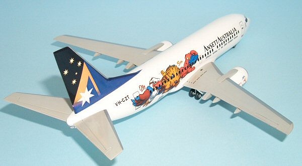 The decals turned out to be a really big problem. The tail logo refused to even lay on the surface let alone conform. After many attempts I gave up, leaned back in my chair and tried desperately to figure out what to do. Aha!! Virgin Blue took an ex Ansett 737-300 and applied their livery over the Ansett colours. Tramping back upstairs to my trusty PC, I surfed over the Hawkeye Decals and within 20 minutes ordered Ansett decals depicting the 3 Sydney Olympics 2000 mascots, Syd, Millie and Ollie. They look so nice on the sheet I purchased another sheet at WASMex 2004!