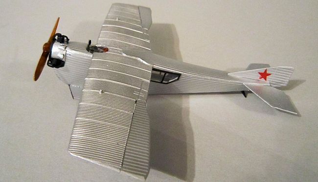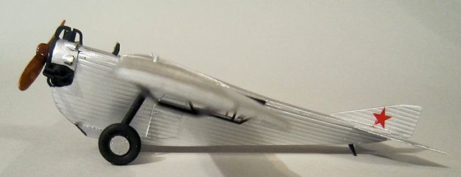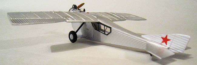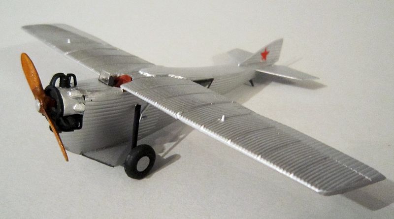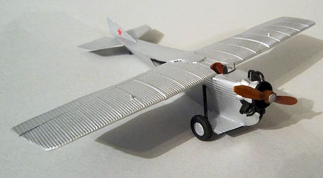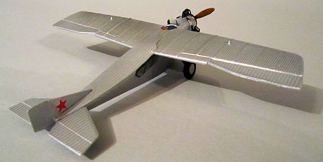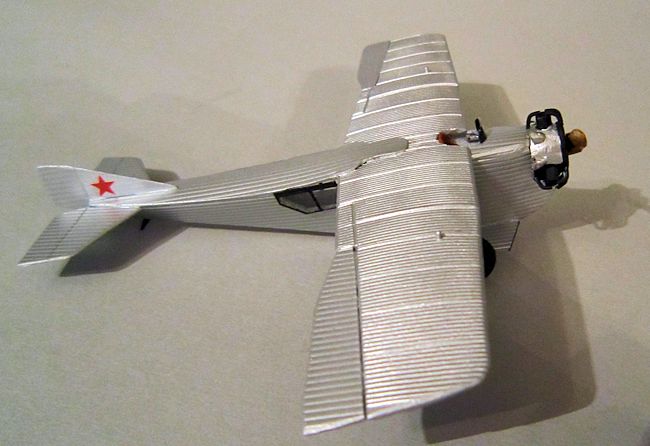 The undercarriage is a simple affair, consisting of two axles faired to make a near sesquiplane type wing, and a couple of supporting struts. Wheels and propeller came from the Bag of Handy Wheels and Propellers in the spares box. The rest of the original kit, including two nice different prop spinners and the whole ANT-5 fuselage were put in the Bag of Many Things, also in the spares box. After the engine, making the tailplane from corrugated sheet was a walk in the park. A door can be cut from plan, and glued onto the port side, with a small handle made from thin rod.
