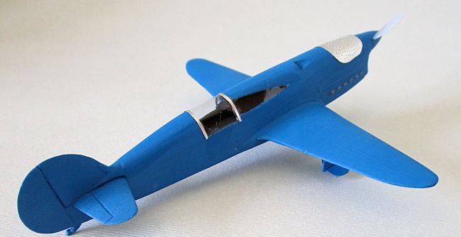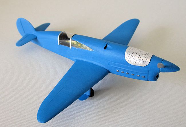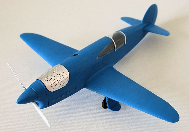 Finally the propeller. Remove the kit's three blades, fill the spinner with more card, more filler, and more sanding, then re-attach two of the blades and set it at ten to four.