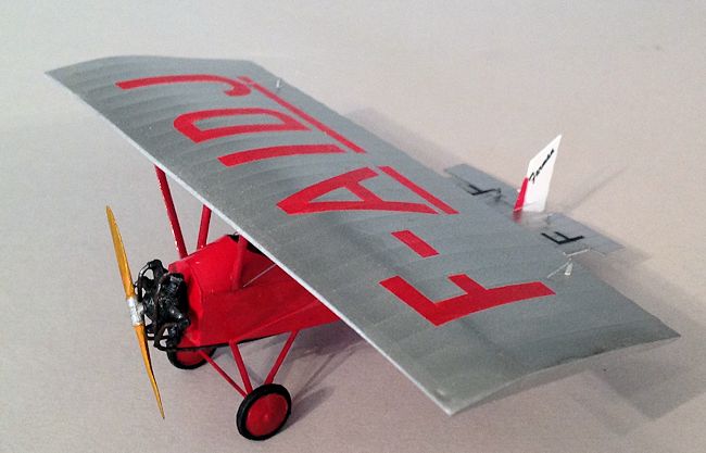 Finally the prop, from the Big Bag of Dead Props was given a wooden appearance (mid stone, dark earth streaks) and a coat of clear orange. Mount it at ten to four, and voila. One tres belle little Post Card from the golden age of French aviation.