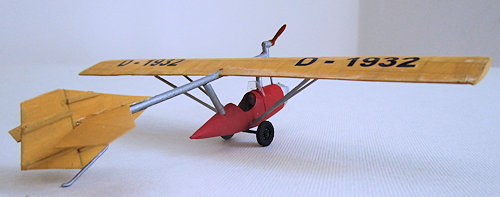 After that it is all plain sailing. The wing is one piece of 10 thou card, folded over at the leading edge, but not before the ribs are scribed inside with a steel rule and biro, and a spar placed at about 1/3 of the chord, back from the leading edge.