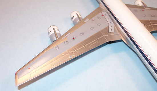Corroguard is a protective anti-corrosive coating used on wing and stabilizer spars and critical areas on all modern passenger aircraft. It is a medium gray color, and I mixed this color using Testors gloss white and Testors gloss gray, just out of the clear square little ¼ oz. bottle. Once this color was mixed and thinned, I masked off the wing root locator tabs and sprayed several coats of this gray on the wings and horizontal stabilizers, and allowed several days drying time to eliminate tackiness or fingerprints caused by premature handling of gloss paint that is “drying” but not fully dry.