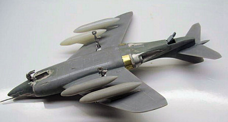 The air intake on the centreline of the fuselage and a section of the spine was also a white metal piece which had an aerial built on it were then fixed in place. These were so delicately produced that these hardly needed filler. Finally the nose cone which is metal was fixed and blended to the wood section adding filler where needed. The refuelling probe was shortened by 3mm to bring to correct size and fixed in the side insert of the metal nose. The boundary layer bleeds were then fixed to the intake fuselage area. The cut cockpit bath tab was wide enough to take the metal detailed ejection seat and the brass etch, pre painted instrument panel fixed in place. The super clear vac form canopy was carefully cut to fit and fixed using white glue. The brass etch air intake doors, four in number were fixed in closed position at a recess to the rear of the wing root trailing edge. The completed model with so much solid metal parts added had a weighty feeling and this was quite appropriate to the Scimitar in real life.