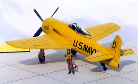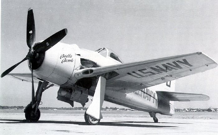 The SNJ was replaced in late January of 1949 with an all orange-yellow F8F-1 "Bearcat". A centerline pod was rigged to the F8F to hold the parachute-rigged dummy, smoke canisters were fitted to the tailhook well, and the show continued with the same routine. After the Blue Angels transitioned to F9F "Panther" jet in mid-1949, the parachute dummy pod and smoke canisters were removed and "Beetle Bomb" was used for advanced aerobatics before the main show. It performed this task until Lt. Bob Longworth tragically crashed attempting a roll on takeoff at a training show in Pensacola on April 24, 1950. This ended the Blue Angels use of "Beetle Bomb".