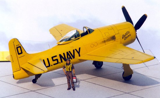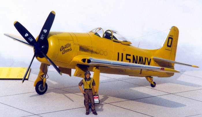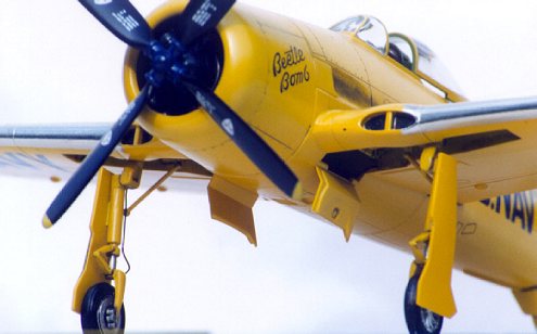 Decals for "Beetle Bomb" were supplied in the kit, but the blue looked a little more like Blue Angels Blue, whereas "Beetle Bomb's" lettering was done in a darker insignia blue. The kit decals appear correct in the linear size, but look a little short in their height. Since I had an unused SuperScale sheet for "Beetle Bomb", in which the lettering was printed in the correct shade of blue and the correct height, I decided to go with them. Needless to say, I was not sorry. Like all of SuperScale's past decals, these went on with no hassles and only required solvent in the wing and fuselage recesses. The polished metal leading edges on the wings, horizontal tails, and vertical tail were done using Bare-metal foil.