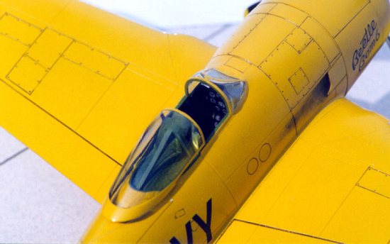 The cockpit area in the kit was quite adequate, with both side consoles and the instrument panel exhibiting correct instrument and control markings for a "Bearcat". I drilled out all of the recessed holes in the side consoles where a flip switch would go and inserted aluminum beading thread into these holes. I scratch-built the emergency hydraulic hand pump to the right of the seat bucket from copper wire and styrene tube. The seat bucket, part A4, seem to fit too far to the rear when inserted into its location hole in the cockpit tub. This was easily remedied by drilling a new location hole about 2-mm forward of the existing hole.