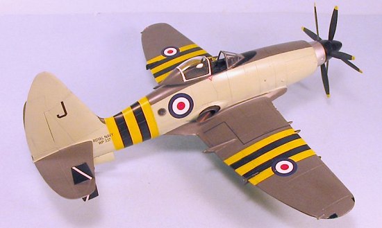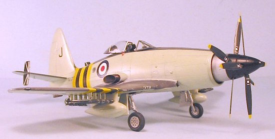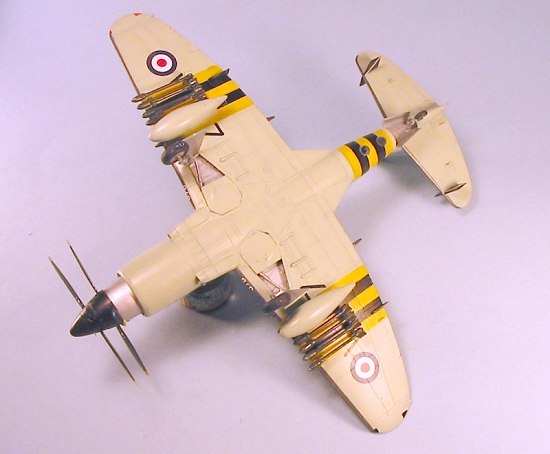 When that was dry, I attached the eight underwing rockets, the wheels of the landing gear and the prop blades. I unmasked the canopy and attached it in the open position. I did not ding the model further, since photos show these airplanes were well-maintained and clean.