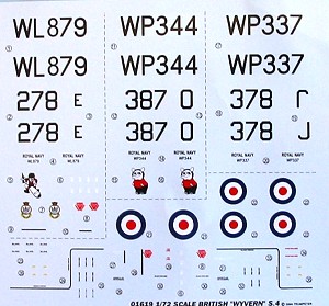 Decals are provided for three aircraft, including the de rigeur #378 from 830 Squadron in Operation Musketeer. Modelers should remember that during the actual operation, none of the Wyverns carried side numbers, since those had been overpainted with the yellow-and-black stripes, and the side number was only re-applied that December.