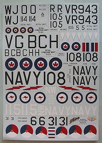The superb decal sheet was designed by Jennings Heilig and provides markings for six aircraft. There are two Fleet Air Arm Korean War airplanes, the de rigeur Peter Carmichael airplane from 802 Squadron aboard HMS Ocean in May-September 1952, and an 801 Squadron airplane aboard HMS Glory during her second tour in April-June 1952 (this latter are also the markings of the Sea Fury restored by Ellsworth Getchell in the 1970s). The two Royal Canadian Navy Sea Furies come in early and late camouflage and markings. The Royal Australian Navy Sea Fury is the well-known overall dark blue Sea Fury flown at Nowra in 1960, while the last is a Sea Fury F.B.50 flown by the Royal Netherlands Navy from the carrier Karel Doorman.
