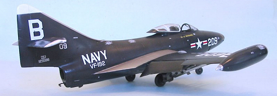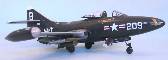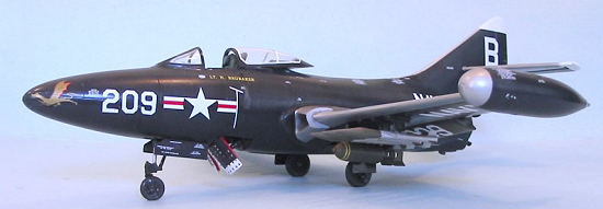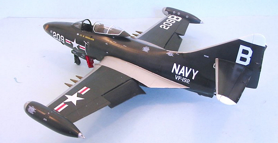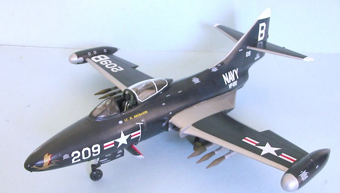 The kit is so well designed a modeler would have to make plans to screw it up in assembly (though trust me, there are still small but significant mistakes to be made). The resin is hard and smooth, with parts fit better than nearly any other resin kit I have worked on. A full suite of bombs and rockets is included. Markings are for Harry Brubaker’s “Two-Zero-Niner” of VF-192 Golden Dragons (which was a real airplane flown with the “LT. H. BRUBAKER” marking for the rest of the time the squadron flew the Panther after it starred in the movie), a Marine Panther of VMF-232 in Gull Grey and White, and the Number 5 solo plane from the Blue Angels’ 1955 team. I thought about making that airplane in memory of my childhood experience seeing it fly, but settled on the (to me) more meaningful “Two-Zero-Niner.” The decals include complete stenciling in black and white for the two operational Panthers.