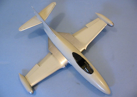 Once the cockpit was installed, it was time to mate the fuselage and wing. It’s a good idea to test fit here, too, since I found I needed to sand down the edges of the fuselage where they mate to the upper wing to get a good smooth fit along the lower surface joint areas. The model has some gaps fore and aft below where the wing fits to the fuselage, which were easily filled with gap-filling cyanoacrylate glue and hidden under a couple coats of Mr. Surfacer 500. I then attached the horizontal stabilizers, which also needed some gap-filling C-A applied with a toothpick, and some Mr. Surfacer to smooth the joint. I finished off major assembly by attaching the tip tanks - be careful about doing that right, test fit first, since they are “handed” to insure the correct one goes on the correct tip. Fit them first, then glue them. More CA gap-filler and Mr. Surfacer was needed for that joint also.