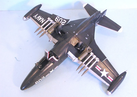 When all this was done, I fitted the wing pylons. Here I made a mistake that wasn’t recognized as such until it was too late to fix it. The kit provides both the Aero racks for rockets and the Mark 51 racks that could carry either rockets or bombs. Most F9F-5s used the Mark 51 racks. Very definitely, Two-Zero-Niner used the Mark 51 racks, as I discovered looking at the movie after attaching the Aero racks and having painted and decaled the model. Memo to self: “Do all research beforehand.” This is one of those boo-boos I can live with, since the airplane could have used the Aero racks (they were interchangeable), and 99.999999999999% of those who look at the model, even “Panther experts,” will be unlikely to spot the mistake.