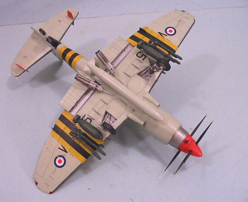 I had determined early on that I didn’t want to do yet another Wyvern with the wing drop tanks, as all the others I have ever done have been thus equipped. I used the bomb rack and the 1,000-lb bomb, with four sets of rockets, to arm the airplane as it likely was for the first airfield strikes during Operation Musketeer. There are damn few photos of these airplanes during the operation, so coming up with a “standard” ordnance load is a bit of an educated guess, but these airplanes were the only ones aboard Eagle capable of carrying two 1,000-lb bombs (the others being Sea Venoms and Sea Hawks which only carried rockets), which would have been needed to disable the runways of the airfields struck in northern Egypt on the initial strikes.