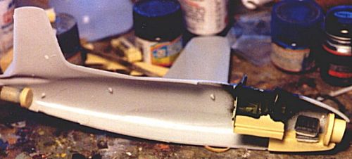 The cockpit is nice cast resin. I had no trouble finding and using the throttle and control stick. On the first kit, I painted the molded-on seatbelts, which was acceptable but not great; on the second I sanded them off and used some old True Details P-E seat belts, which to me looked much better. The modeler must test-fit everything here to get a slight back-angle on the rear bulkhead/seat back. Insure that when the cockpit is in position it will fit so that the small "vanes" on the back of the headrest fit against the plastic bar of the fuselage; this backplate is also too wide, and will have to be trimmed to fit. You must also be very careful when assembling the cockpit into the fuselage to insure that it is properly aligned vertically and horizontally - it wants to tilt to the right.