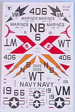 The decals are superb, being designed by Eagle Strike. They provide very colorful markings for an FJ-4B of VMF-232 "Red Devils" and one from VA-116 with orange lightning flashes, and another from VMF-451 with a very striking black dart on the vertical fin. There are no stencil decals, but these can be cobbled together from other sheets if you "gotta have 'em."
