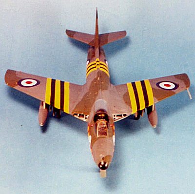 After shadow-shading the panel lines with flat black, the first thing to do was paint the Operation Musketeer ID stripes. These are supposed to be 12 inches wide, in yellow and black. After air brushing the yellow, masking with 1/4" wide tape revealed that the stripes would not be right. After eyeballing some photographs, I determined that the stripes were narrower than called for and did them as 9-inch stripes. These resulted in the stripes fitting exactly the areas of the model they were supposed to. About a month after completing this model, I discovered that the stripes of the aircraft based in Cyprus were most likely not yellow and black, since there had been no yellow paint available on the island in the quantities necessary for all the aircraft based there. The Canberras had been painted in black and white "Normandy" style invasion stripes, and it is likely the Hunters were painted with British Army "Desert Sand." These were also very hurriedly applied by hand, so they would likely have looked far more like the invasion stripes applied for D-Day than the neat-looking stripes on this model. The stripes on this model shall remain yellow-and black.