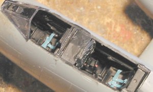 I then proceeded with the cockpits. They come as separate cockpits and were fitted as such. Each cockpit was painted flat black, and was dry-brushed with dark grey and aluminum paint to bring up sufficient highlights to be able to see the detail once installed in the fuselage, and assembled completely. Fitting the instrument panel is difficult, and requires some sanding‑down of the lower section of the panel where it attaches to the wheel well in order for it to fit to the rest of the cockpit.