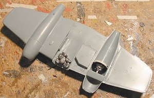 That accomplished, I glued the lower wing sub-assembly to the fuselage, then attached the upper wing sub-assemblies. I only had to worry about filling gaps along the sides of the forward engine nacelles, and narrow gaps along the upper wing to fuselage joint.