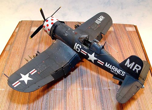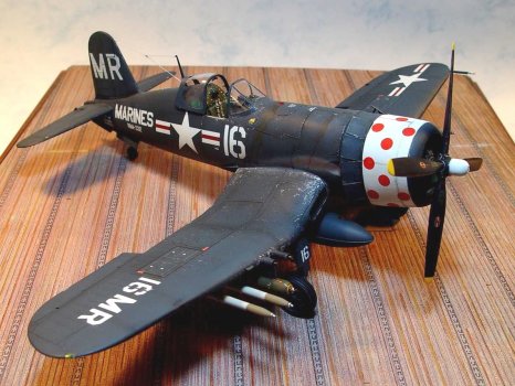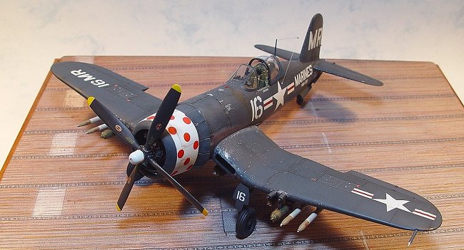 Notes: Kit bash project using the following items: Hobbycraft F4U-1a, True Detail F4U-4 cockpit, bombs and wheels, High-Tech PW R-2800, Verlinden F4U-4 detail set, Squadron Products F4U-4 canopy, Moskit exhaust tips, M.V. Lenses and Monogram Pro Modeler F4U-5n.