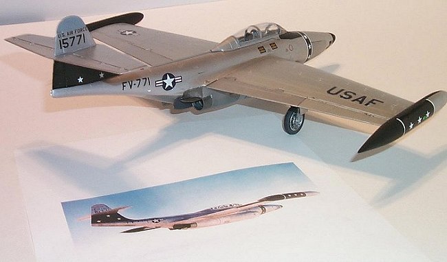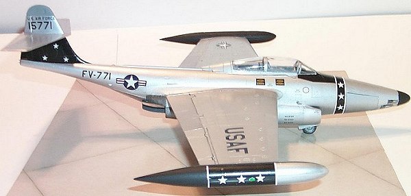 The Scorpions used by the line units were natural metal finishes with various color trims. I wanted a bird from the 57th FIS. The 57th trimmed their birds with a vertical black stripe around the nose forward of the anti-glare panel and the lower portion of the tail was also black. The tip tanks were pained anti-glare flat black on the inside halves, while the outside was NMF with a vertical black stripe at the center of the tank. All the black markings had white stars superimposed on them.