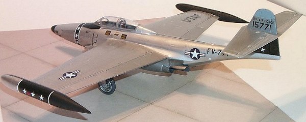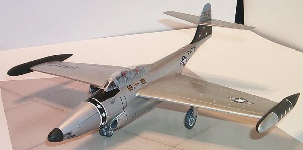 To start the painting, the inside tanks halves were masked and painted flat black. The lower portion of the tail was painted gloss black. The elevator and upper tail had been left off. The upper tail was painted light gray. After adequate drying time the tail and inside halves of the tanks were masked and the entire aircraft sprayed with buffing Metalizer Aluminum Plate. The aircraft was polished using a soft cloth. The movable surfaces, the flaps, decelerons, and elevators were left unpolished to provide contrast. After polishing, the plane was given a light coat of Metalizer sealer. Now, different panels were masked off for painting in various shades of Metalizer colors. The leading edge panels on the wings and elevator, top and bottom, and the engine intakes were painted in chrome silver. The gun bay doors, aft half of the engine nacelles, the flaps and landing gears and wheels were painted with non-buffing steel. The exhaust nozzles and the exhaust deflector keel panel, aft of the engines and gun blast panels were done in burnt metal. A light coat of sealer was then applied and after drying the masking removed.
