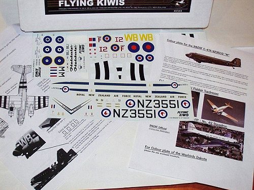 Flying Kiwis’ Dakota uses repackaged Italeri C47 mouldings with locally produced decals and information pack, Colour chart and other goodies. |
