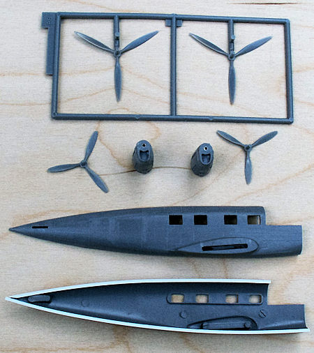 The nacelles did not fit very well, and the shape was not too good. They needed a lot of sanding and filling before they would do. The exhausts were very crude, but were possible to improve with a new pointed scalpel blade. I put some brass tubes into the nacelles as bearings to make the propellers turn properly. It is a good idea to let one tenth of a mm of the bearing tube protrude from the engine front plate, this will secure a free turning of the propeller.The gauge of the hole in the brass tube should be one tenth of one mm bigger than the propeller shafts. It was not possible to secure the propeller shafts inside the nacelles from falling off, but it is only a question of not letting the model point downwards, when handling it.