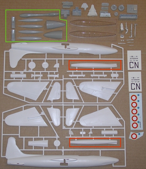 The analysis is based on the second kit (SO 6026), and remarks are the same for the other box. The good surprise come with the slick surface of the fuselage, better than older grainy kits that allow us to get good NM finish. The prototype was very simple and the kit is obviously in the same way. Documentation is not very well known, but I get a French made review called LE TRAIT D’UNION, which is a branch of AIR BRITAIN, and deal with the SO 6020 and derivatives. Drawings, and b/w pictures allow me to tell that these kits reflect the reality. After flashes removed, the fuselage halves join well, even without location pins. The wings will require test fitting and putty to join perfectly (think to make a jig to respect the 10° positive angle dihedral ), while you ‘ll open larger the fuselage fences. The stabilisators are 0 angle glue. The long ventral air intake in two parts is not mounted (see red rectangular areas), instead of that, the two resin rectangular intakes will be housed in the pre-scribe panels in the rear fuselage. Surgery is also required around the nose (see internal marked line), cut it and replace the flat sides and under nose with the solid rounded two parts resin “fighter version”.