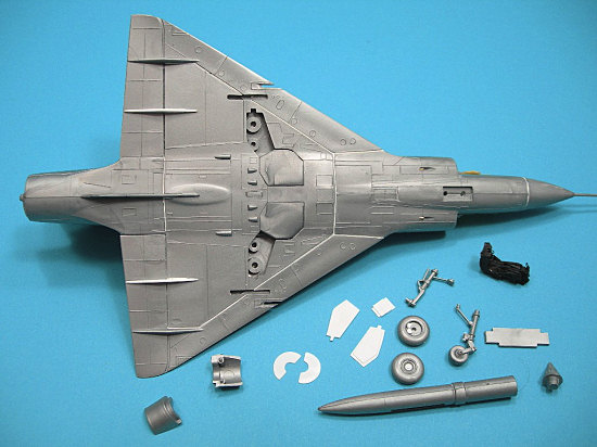 Airfix’s ancient Mirage IIIC consists of 43 individual silver parts with petit raised panel lines and a one-piece clear canopy. The cockpit detail is limited to a pilot, Martin-Baker seat and some minor detail on the instrument coaming. Separate intake bullets are glued from the inside (becomes part of the cockpit sidewall) and the other fuselage additions are the radome, separate nose probe, lower aft fuselage strake, fuselage pylon and a two-piece Atar engine afterburner assembly.
