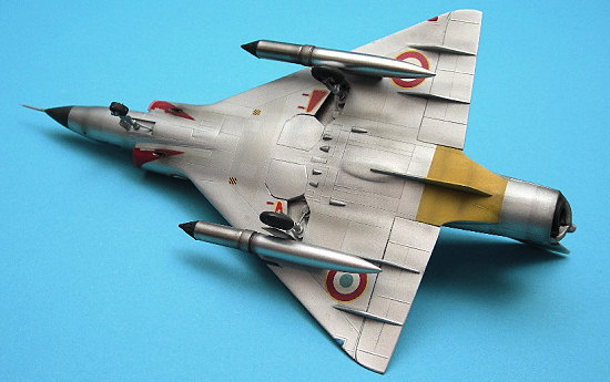 External stores are limited, though somewhat exotic. Airfix supplies a single air-to-air Matra R.511 missile for the fuselage station. Unfortunately, all the flying surfaces are way too thick (to be expected for a 1964 mold), lower fin is missing and the fuselage shape is not correct. The other stores are the air-to-ground Dassault JL-100 combination rocket pod/fuel tanks for each wing and these look good. All of these stores are firmly held in place with some rather thick pylons. These pylons and the separate inner control surface actuators all fit into large receiving slots. One of the nice things about the wing is that Airfix actually captured the downward curvature at the wing tips.