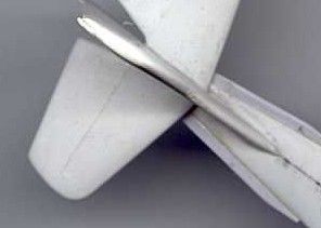 As with all vac form models small strips of plastic card from the backing sheet were cemented around the edges of one fuselage half. This served as aid to correctly locate the halves together and also to provide a strong joint. The single unit tail plane was glued in place, followed by the tail fin and rudder. Any small amount of filler to the fuselage and tail joints was added and sanded to smooth finish upon drying. Some attention was given to the air intake fitted to nacelle underside. The accompanying drawing shows the various antennae, small intakes, and other items to be added in order to make the scale replica more detailed.