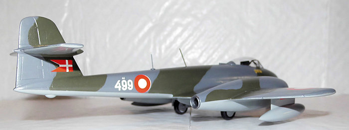 The Danish government bought 20 Meteor F.8 in April 1950 and deliveries began the following January. The aircraft served with the newly established Eskadrille 724 (Squadron 724) at Karup and they got the type numeral 44 and individual numbers running from 481 to 500. In 1952 the Squadron moved to Aalborg, where it stayed for the next six years. As Eskadrille 724 exchanged its Meteor F.8s for Hawker Hunters in 1956, the Meteors got new assignments such as liaison and training flights as well as performing target tug duties. Of the 20 delivered Meteor F.8 three where lost in crashes, several were during the late 50s / early 60s scrapped / used in fire drills and the last flight of a Meteor F.8 in Danish service took place in September 1962.