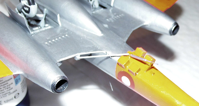 After retouching the intakes with silver paint, the wings were prepared (ensuring a perfect fit as possible) to be attached to the fuselage, as was the complete tail unit. Regarding the tail unit, I found out, that by gluing a piece of sheet at the end of the main fuselage and trimming the edge very precisely, I could achieve that the tail would literally “slip” on and at the same time be perfect aligned with the rest of the aircraft seen from all angels. When all this was accomplished the wings and tail unit were glued to the fuselage. The last action done on the airframe was the filling and sanding of all wing / fuselage / tail seams plus the inevitably other imperfections still around the airframe.