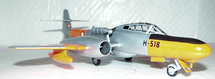 The final bits consisted of attaching the gear doors and various antennas with CA-glue and painted their respective colors when the CA-glue had set. The last thing attached was the mill housing / plinth glued carefully to the starboard inner wing section and a slight touch up with silver paint between the plinth and the wing surface and after attaching the propeller to the mill housing, via an axle I had glued to the spinner, the model was finished.
