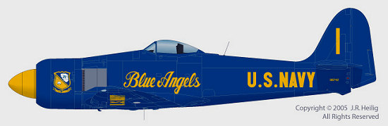 As I mentioned earlier, the Blue Angels have gone through several iterations of their livery. What Jennings worked up was based off a contemporary Blue Angels bird, the decal set which I had at hand was for the very first years the Blue Angels were flying and they marked their planes different then. The Blue Angels crest wasn't yet developed and the "Blue Angels" in script was both much smaller and only on the engine cowl, not the side of the fuselage. Still though, I think the inspiration is well served.