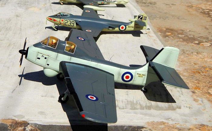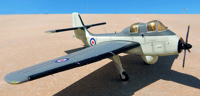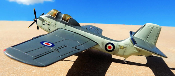 There were two decal options: An RAF Coastal Command aircraft in overall dark sea grey and a Fleet Air Arm example in sky and extra dark sea grey which I chose to do. Model was sprayed using Humbrol paint. The black de-icing boots were brush painted. Dark grey decal was used for wing walk-way areas. In spite of age on the kit, the decals behaved very well and adhered without any difficulty.