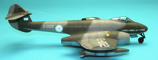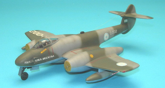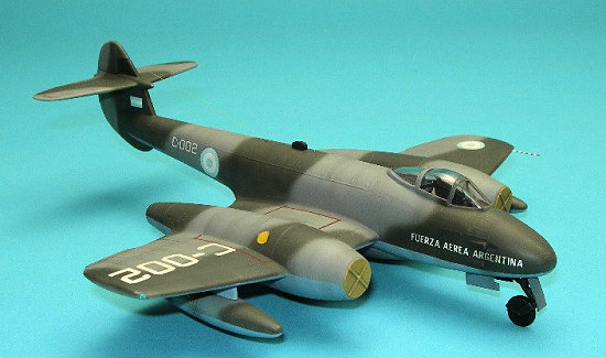 The first 50 had been built for the RAF, but the second batch of 50 was Argentine from the start; indeed, these were the first exports of the Meteor. In Argentine service they were originally used as that nation’s interceptor and were coded I-001 and up and were painted high speed silver overall. Later in their career when they were assigned as ground attack aircraft they were coded C-001 and up and adopted a tactical camouflage.