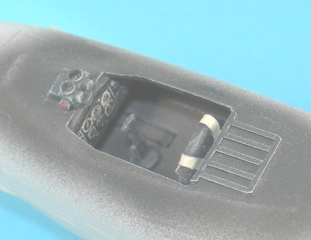 Thankfully, the British were painting their cockpits black when this aircraft was in service and with the canopy molded close and the cockpit opening being quite small; cockpit upgrading was kept to a minimum. Improvements were limited to; an aft bulkhead made from card, card detail added to the gun sight molded to the fuselage, some strips added to the aft decking, both the instrument panel and seat were borrowed from the Airfix Meteor kit with the seat receiving a lead foil harness. Since FROG supplied a decent control arm it was straight to the paint shop and a coat of black. This was dry brushed with grey to supply some contrast and the harness was painted a buff colour. Airfix supplies an instrument panel decal (with their current boxing) and this was used. To improve the appearance of this decal, a drop of Future was added on each instrument face to replicate the glass. Some lead weights were added to the nose and the cannon ports were drilled out, and then the fuselage was glued together, clamped, and left to cure.