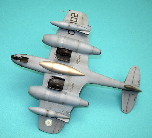 With the model primed and ready for paint, the lower surface panel lines, wheel wells, landing gear and inner doors were sprayed black. For the blue on the lower surfaces; Model Master RAF Azure Blue was close enough so it was applied. To break up the lower surfaces a little, some panels on the engine nacelles were masked and sprayed a darkened mix of this blue. When the enamel paint had cured, the lower surfaces were masked to copy the sharp division line that was on the full sized aircraft.