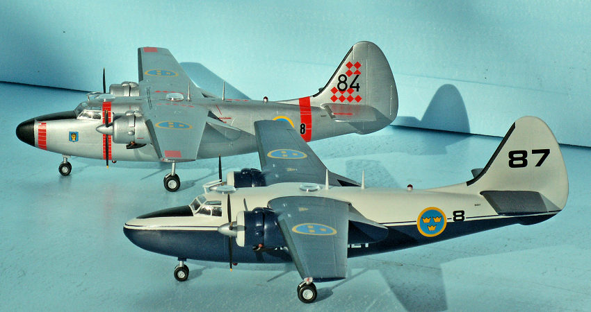 Decaling: I bought a special decal sheet from RB Decals covering Tp 83 Pembrokes of Flygvapnet. There are options for nine aircraft, including the VIP aircraft with the blue/white color scheme. I choose to make the 83007 “84” from the F 8 wing, and the VIP 83017 “87” also from F 8, Barkarby near Stockholm. This decal sheet is high quality with perfect register, and the stencils are readable with a magnifying glass. Decaling the models was rather easy, with the exception of the narrow blue band around the nose of the VIP plane. The blue band had to be cut in very small pieces to get around the nose. However, because of the high quality of the carrier film, it was possible to make it look acceptable. Doing this, I looked at the drawing that came with the decal sheet, and this explains why the original looks different, the blue line droops a little more at the nose tip.