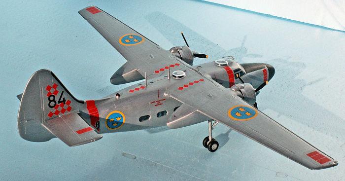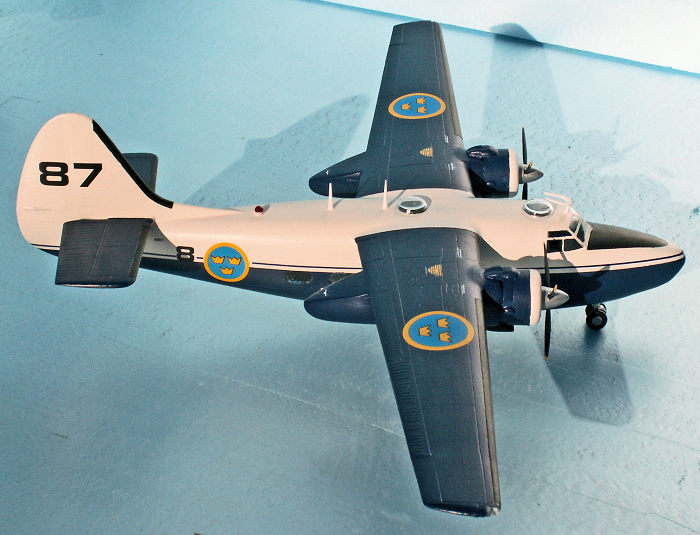 Pembroke no one: aluminum all over. There are flat black anti icing devices on the front of the outer wings, tail planes and fin. The nose is flat black, too, and so is the anti-glare area in front of the canopy. The exhaust pipes are brick red, propeller blades flat black with yellow tips. Undercarriage legs are silver and tires are tire black. The engine cylinders are silver with a touch of black, and the space between the cylinders is black. Carburettor intakes on the underside of the cowlings are black. There are two small beacons: one on the dorsal in front of the fin extension a little to the starboard, and one on the ventral at the cowling fronts. All colors used are Revell Aqua colors. They are easy to apply if the paint is well stirred and thinned with Revell Aqua Thinner.