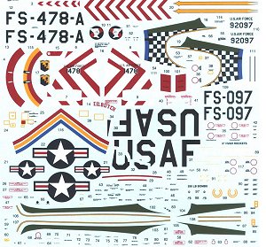 A very useable decal sheet is included with plenty of stenciling and markings for two machines. The first is an early E ( F-84E-1-RE, 49-2097) with the non framed canopy in splashy markings worn by Col Carroll McColpin's jet while he was CO of the 31st Fighter Group at Turner Field, circa 1949. I wonder if McColpin designed this scheme as he also was assigned a P-47 with a checkerboard design when he was CO of the 404th Fighter Group during WWII,. I only note it because checkerboards were not found on any other Thunderbolts in the 404th, just his! The other squadron decal option represented is the 9th Fighter Bomb Squadron, 49th Bomb Wing in Korea, 1952.