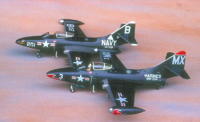 aircraft; one is a Marine F9F-4 assigned to VMF-334, which features a colorful
