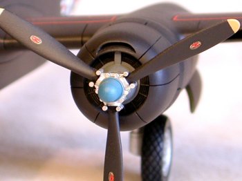The monofilament antenna wires were highlighted with a thin black wash then sealed with Dullcote. Lastly, I painted the engine gearbox covers aircraft gray and drybrushed the cylinder areas with gull gray to put some depth and detail into the cowlings. When dry, I removed all the masking, touched up a few problem areas, then installed the props.