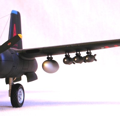The props were painted in the appropriate colors and set aside to dry. Concurrently, I installed the MV lenses underneath each wing with Elmer's white glue then attached the napalm tanks and fragmentation bombs to their racks with small drops of CA. With the model inverted, I painted the wheels and tires then mounted them to the struts with thin 1/16" aluminum tubing wafers serving as retainers.