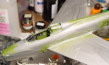 The back of the cockpit got a shot of Interior Green then the same process was used on the back glass as the front. I used Tamiya Tape to mask off the polished glass areas and sprayed them Interior Green to represent the structure you would see from the inside looking out. Then the whole plane got a going over once more to check out for any scratches or blemishes. The silver plastic makes it very hard to see the scratches and some might choose to spray a primer grey down first to uncover those pesky little problem areas.