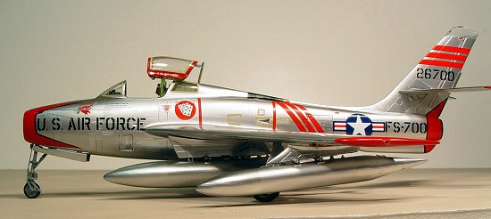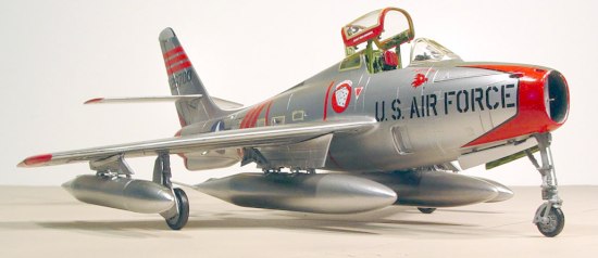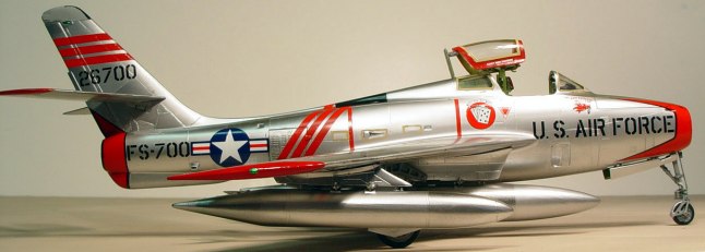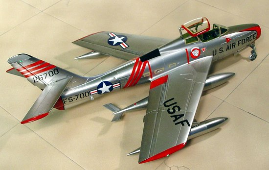 I recommend this kit to all. It was fun and a easy build. It makes a great looking model right out of the box and stands up to today’s standards and can be found for as low as five bucks at some swap meets. If you do not want to deal with the natural metal finish, there are many different NATO nations that used the Thunderstreak. I plan to do a German F-84F in the near future and a Heller RF-84F Thunderflash. They would look great sitting on the shelf with a Monogram F-86D to share the spotlight with. It took about 15 hours to complete due to the silver finish. This time can be cut down doing an South East Asia scheme or a NATO scheme instead.