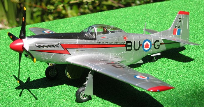 The 442 Squadron was based at Sea Island airport (which is now Vancouver International) and their aircraft sported the attractive red lightning bolt, a red and white spinner, and red wing and tail tips. One note on the red is that the color on the decal sheet is considerably more orange than one might think. I started out with ModelMaster “Guards Red” and found that I had to add quite a lot of yellow before I got a good match. My recommendation for a better starting point might be Modelmaster “Italian red.”